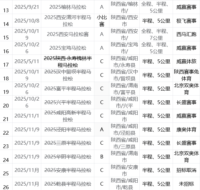Loading... # 一、赛事数量 * 1、在路跑赛事新政的影响下,2025年陕西省内半马以上距离路跑赛事数量大幅缩减,全省拟举办26场马拉松赛事,实际举办了16场,其中包含5场马拉松和11场半程马拉松,A1类认证赛事8场。 * 2、4月20日等时段出现 “多赛同日开跑” 的盛况,赛事密度与参与热度显著提升 * 3、规模呈梯队化:西安马拉松达 3.8 万人(世界田联金标),宝鸡马拉松 3.1 万人,榆林、杨凌等赛事稳定在 2 万人左右,县域赛事如富平、麟游等以 5000-10000 人规模填补基层市场空白,覆盖不同层级跑者需求 * 4、运营情况:威赢赛事运营支撑了6场,西马汇跑运营3场,长盛赛事、陕体西风烈、赛事兔都是有名的本土运营商 下表是汇总的2025年赛事详情和运营情况   ### ### 二、赛事等级:头部赛事引领,认证体系完善 | 赛事等级 | 代表赛事 | 核心优势 | | -------------- | -------------------------------------- | --------------------------------------------------------------------------- | | 世界田联金标 | 西安马拉松 | 西北唯一世界田联金标,中国田协白金标,品牌价值突出 | | 中国田协认证 | 宝鸡马拉松、榆林马拉松、杨凌马拉松等 | 多为 A1 类认证,部分获 “银牌赛事”“最佳生态主题奖” 等称号国家体育总... | | 地方特色赛事 | 麟游夏季半马、陈仓九龙山生态半马等 | 聚焦 “避暑”“生态” 主题,打造差异化 IP国家体育总... | * 西安马拉松作为标杆,带动全省赛事在赛道设计、服务标准、品牌运营上对标升级,形成 “头部引领、腰部支撑、基层补充” 的等级体系。 ### 三、赛事评价:口碑与专业度双提升,融合创新突出 * 1、 **跑者口碑** 赛事服务精细化,如宝鸡马拉松的 “票根福利”、榆林马拉松的 “免费游 A 级景区”、九龙山赛事的 “赛后文旅包” 等,提升参赛体验;医疗保障(AED、定点医院、志愿者团队)与补给体系完善,获跑者广泛认可 * 2、 **专业认可** 宝鸡马拉松 “西北最速赛道” 品牌深化,46.2% 选手刷新 PB;杨凌马拉松 “体育 + 农科” 融合模式成熟,吸引 8.2 万人报名,赛事 IP 影响力持续扩大。 * 3、**融合创新** 赛事与非遗、文旅、商业深度结合,如延安红色半马融入安塞腰鼓、陕北民歌,杨马搭建农科产品展销区,实现 “赛事 + 消费 + 文旅” 多维联动。 --- ### [我的个人博客主页,欢迎访问](https://www.aomanhao.top/) ### [我的CSDN主页,欢迎访问](https://blog.csdn.net/Aoman_Hao) ### [我的GitHub主页,欢迎访问](https://github.com/AomanHao) ### [我的知乎主页,欢迎访问](https://www.zhihu.com/people/aomanhao-hao) 最后修改:2026 年 01 月 23 日 © 允许规范转载 打赏 赞赏作者 支付宝微信 赞 如果觉得我的文章对你有用,请随意赞赏